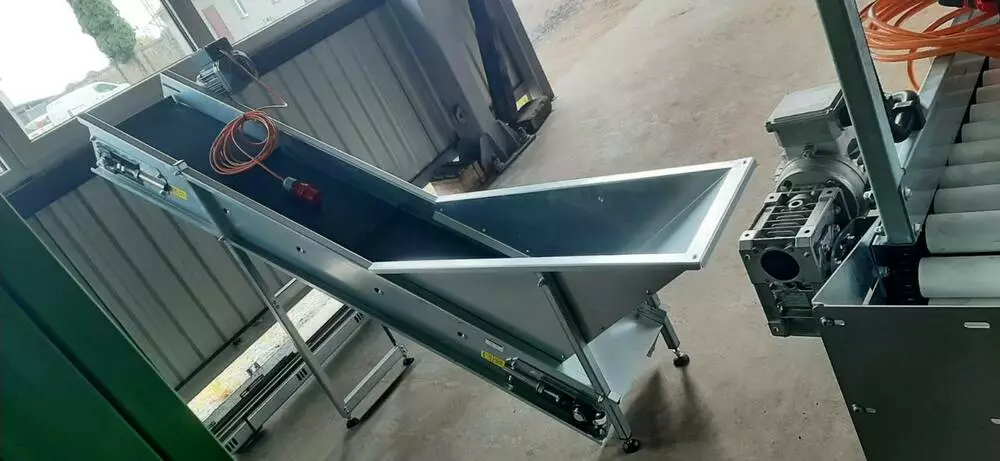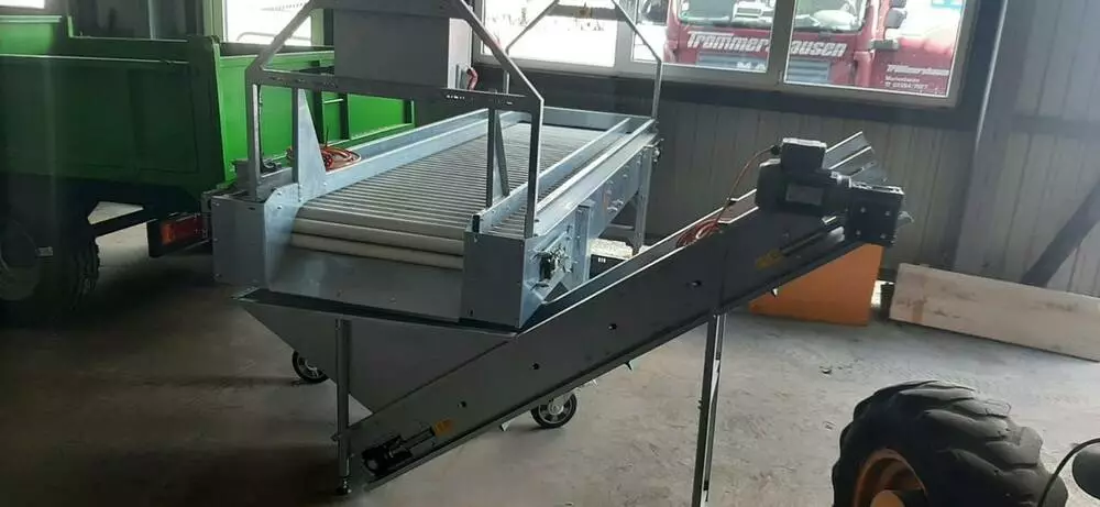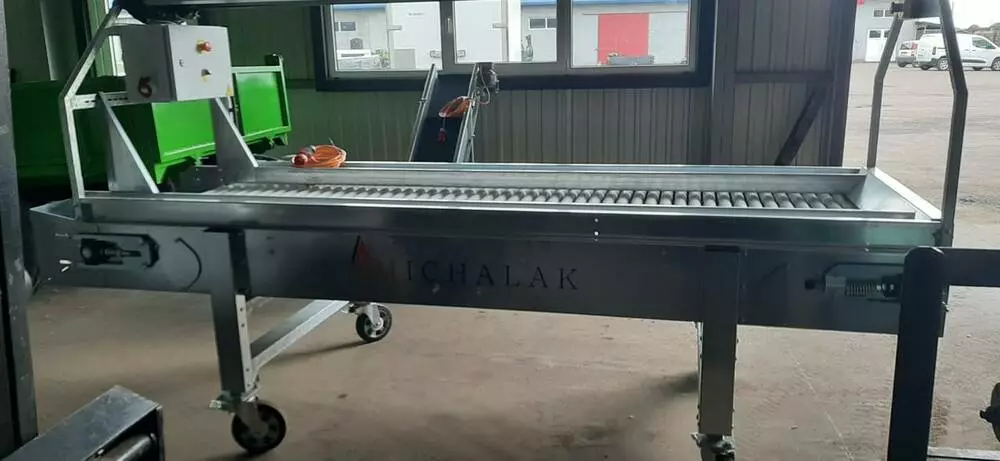 роликовий сортувальний стіл, марки "Michalak", заводський номер 0Z17G43, рік випуску 2025, що використовується в технологічних лініях для ручного сортування овочів, має два рухомих відділення, що дозволяють змінювати робочу конфігурацію. Додатковий поперечний конвеєр для транспортування відбракованої продукції в контейнери наприклад коробкові піддони. Розміри: довжина/ширина/висота: 320х130х155 см, встановлена потужність 1 кВт/2,5А. https://www.youtube.com/watch?v=KKdyvXKPrLs